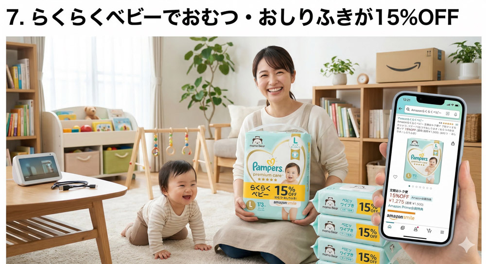 小さなお子さんがいる家庭向けの特典として、「Amazonらくらくベビー」に登録すると、対象のおむつやおしりふきがいつでも15%OFFで購入できます。