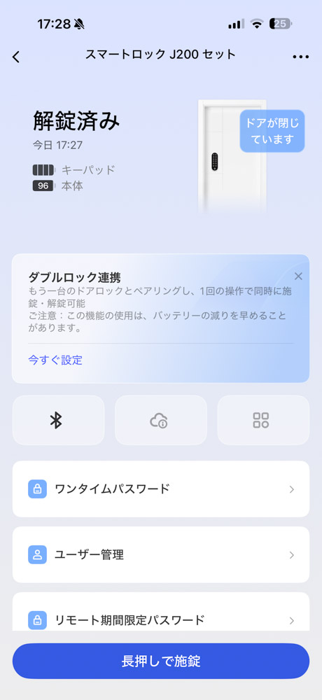 しかし、J200ならiPhoneのバッテリーが切れてしまっても、リザーブパワー(予備電力)によって一定時間はHome Keyでの解錠が可能です。