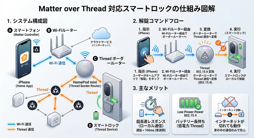 - 遠隔操作には「対応ハブ」が必須 外出先から鍵の開け閉めをしたり、他のスマート家電と連携させたりするには、Threadボーダールーター(HomePod、Home Pod mini、Apple TV 4Kなど)が別途必要になります。