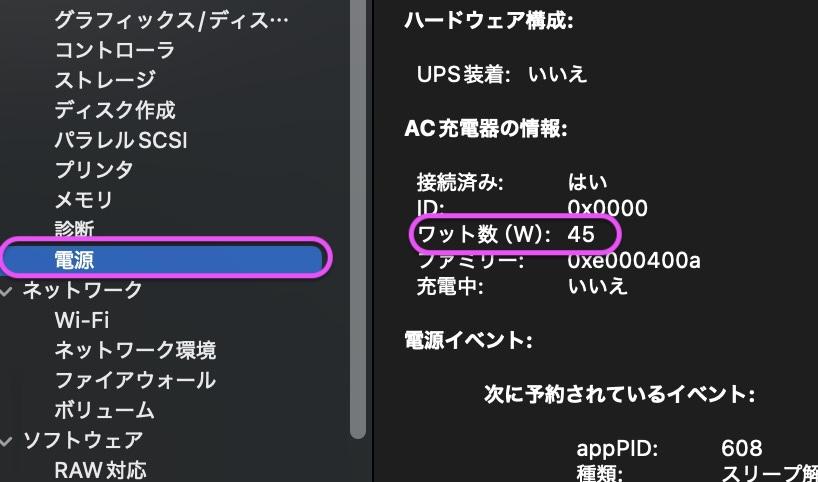 MacBook Airのシステムレポートで確認したところ、最大45W出力の電源として認識してくれています。
