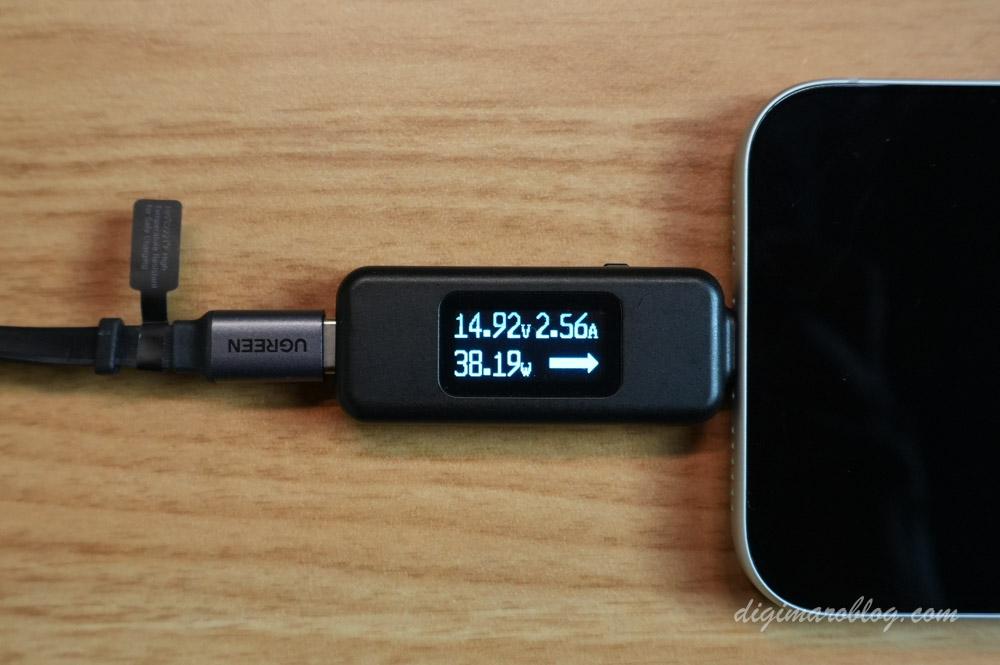 iPhone17 Pro Max のバッテリー残量8%から確認して、最大38Wから39W付近で充電できました。
