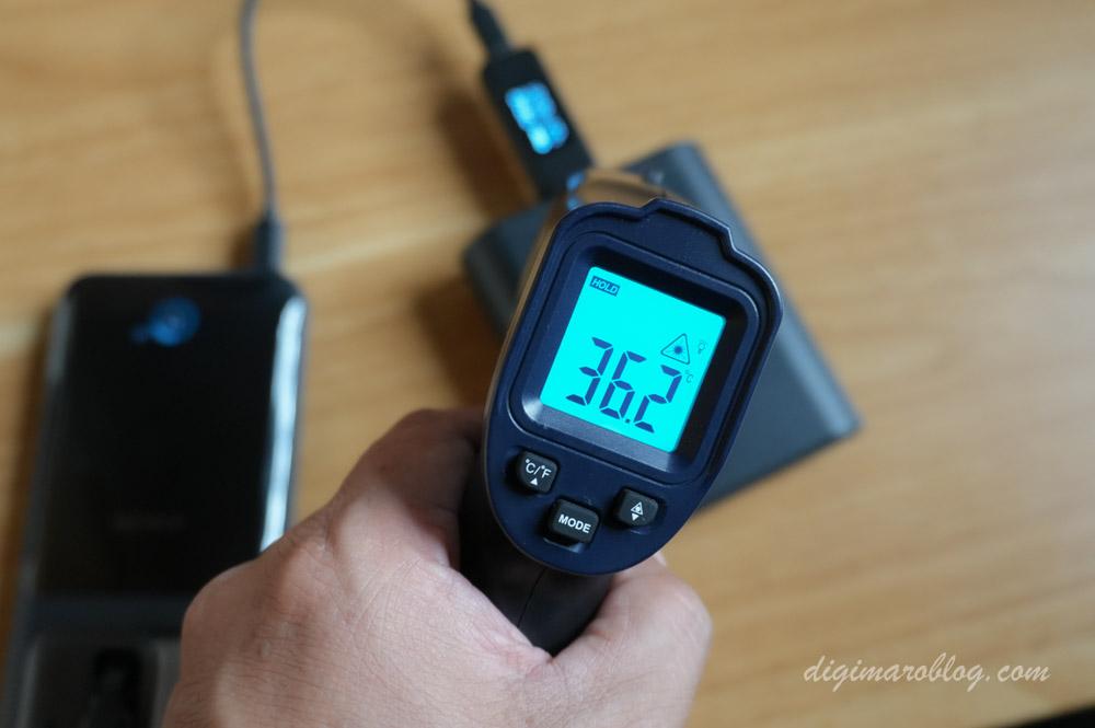 本体フル充電時に計測しましたが、最高でも36.2℃という結果でした。