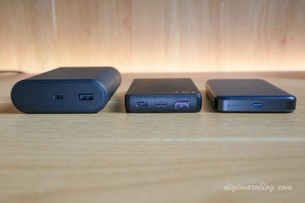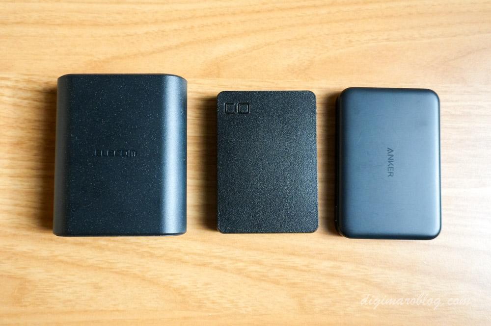 3台中左がエレコムEC-C27LBK、中央はCIOの10,000mAh、右側はAnkerの10,000mAh。