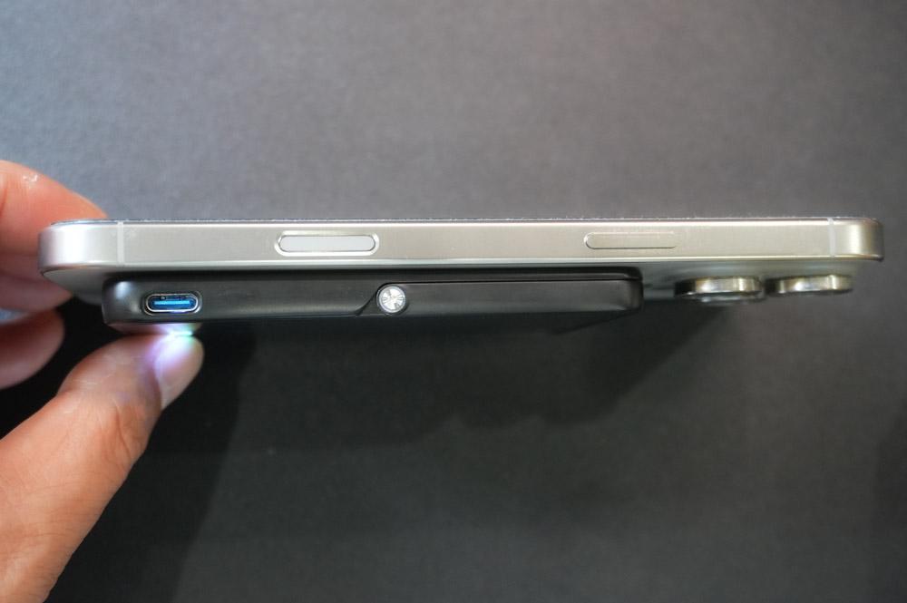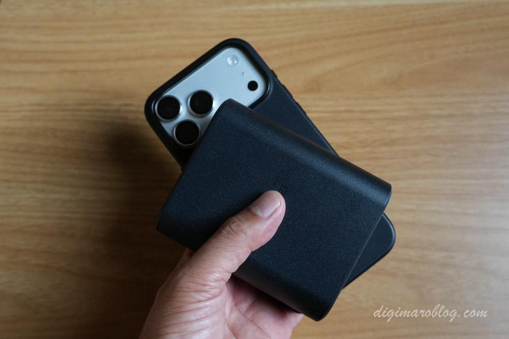 USB-CのU字アダプタを使えば、iPhone本体に密着させることもできます。