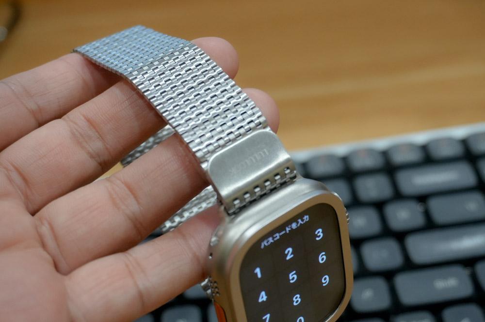 マグネット採用で着脱はワンタッチ、美しいステンレスのミラノループメッシュデザイン、それでいて金属製純正バンド(ラミレーゼループ)の1/4の価格。