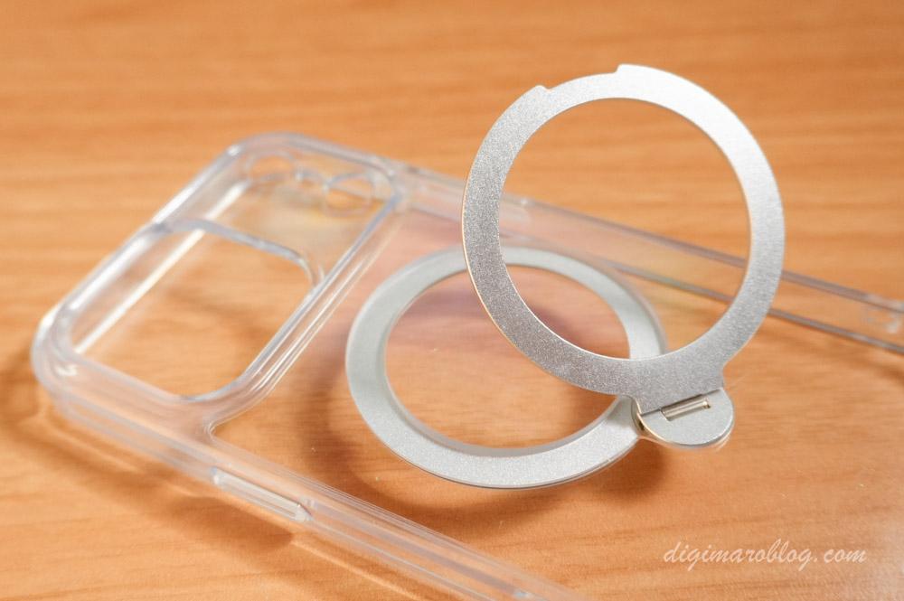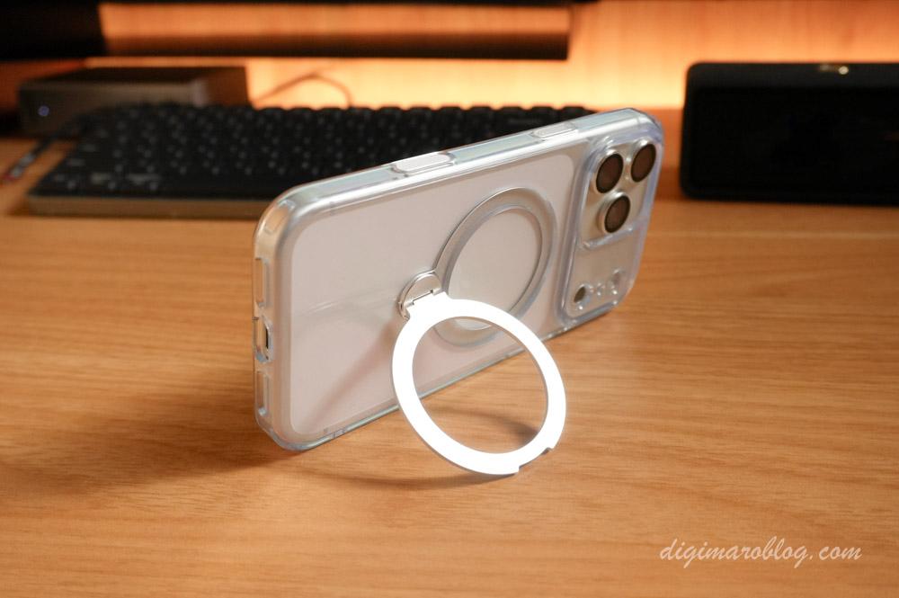 360°回転スタンド付きで、マグネット内蔵でMagSafeアクセサリーにも対応していて便利に使えます。