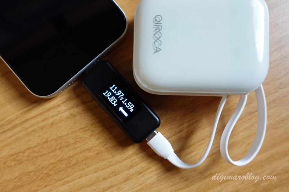 USB-Cはケーブル、ポートともに公称どおり、20W近くで急速充電してくれました。