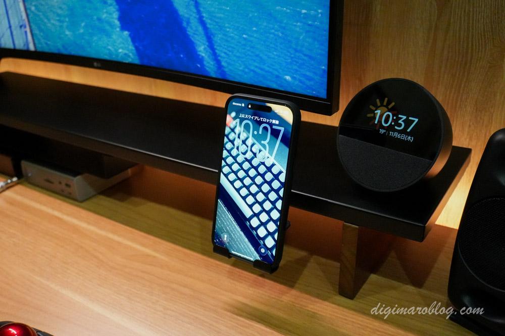 デスク上でいつも迷子になるiPhoneの定位置も確保できます。