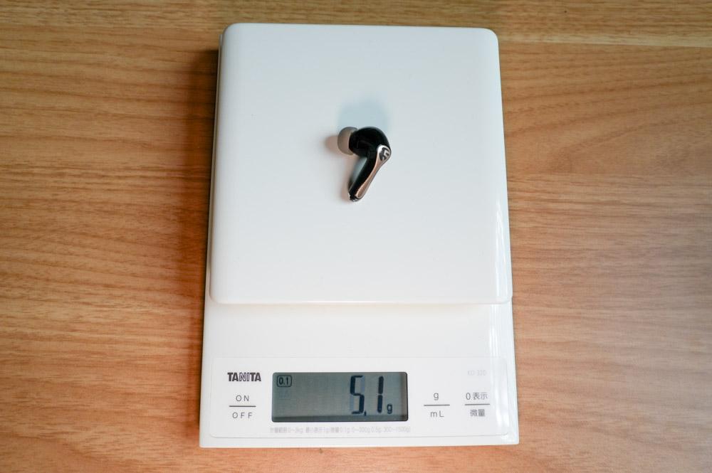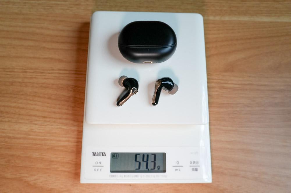 イヤホン片側の重さは実測で5.1g、総重量は54.3gとコンパクトで軽量な設計。