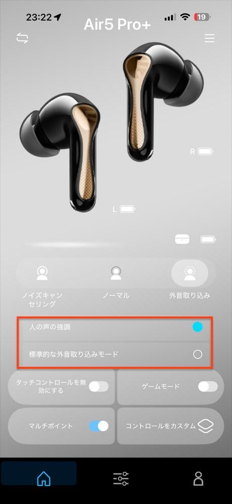 外音取り込みは、一般的なものと、人の声にフォーカスした2種類のモードから選択可能。