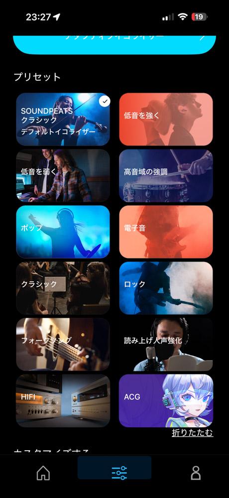 イコライザーは、聴覚テストからユーザーに最適なリスニング状態を提供してくれる①アダプティブイコライザー、②11種類のプリセット、帯域ごとにカスタマイズ可能な③カスタムイコライザーの3種類から選べます。