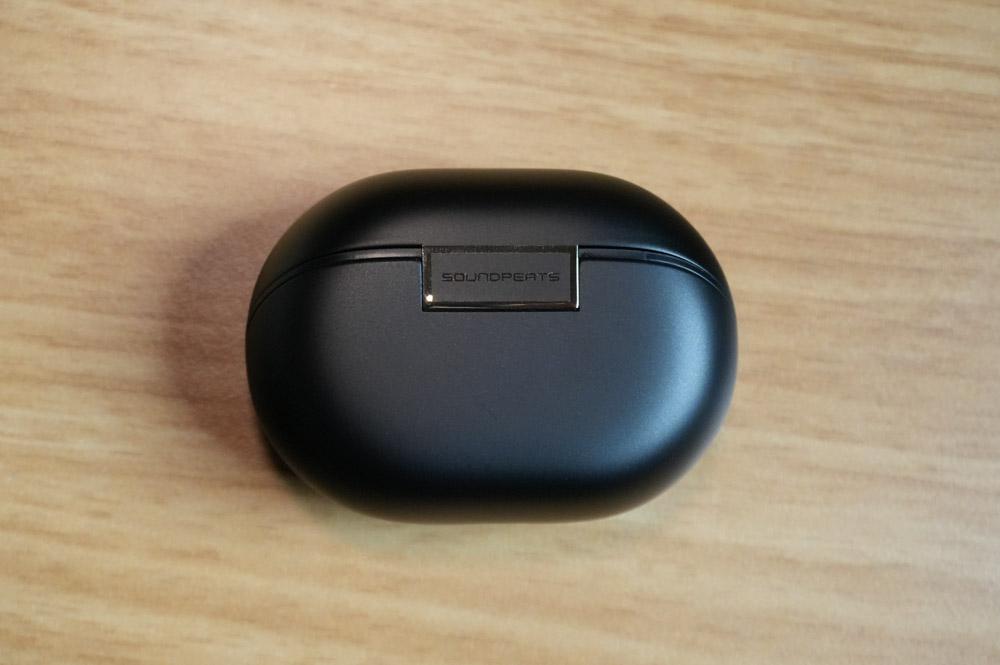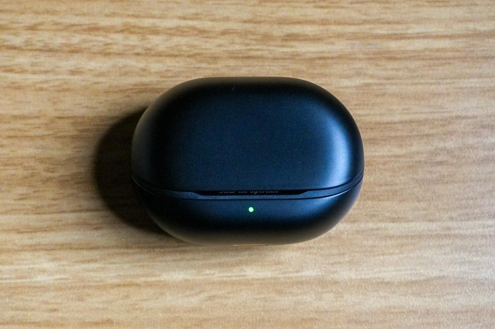 充電ケースはマットブラック。中央下段に、バッテリー残量残量とペアリング状態を示してくれるLEDインジケータ。