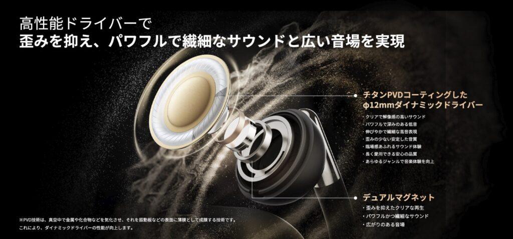 12mmデュアルマグネットドライバー+チタンPVDコートで、パワフルかつ繊細な高音質を実現。