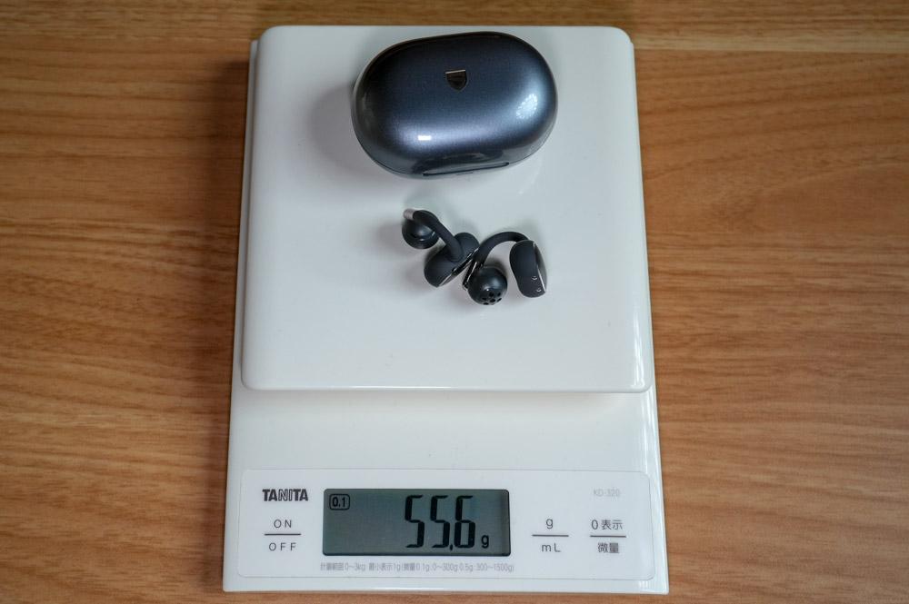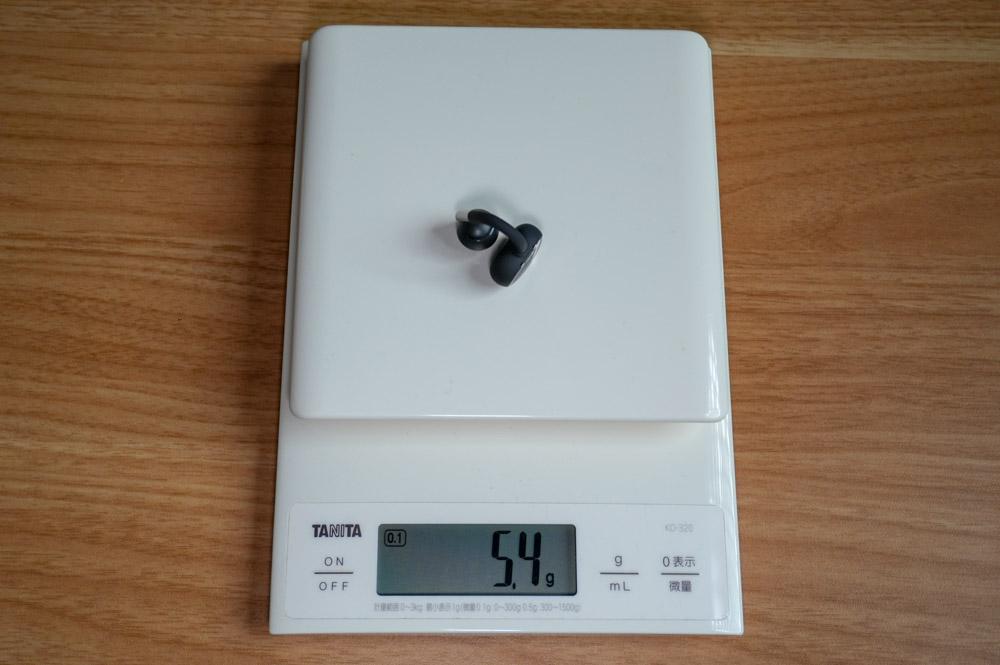 実測でイヤホン片側5.4g、総重量は55.6gと見た目の割には軽量ボディです。