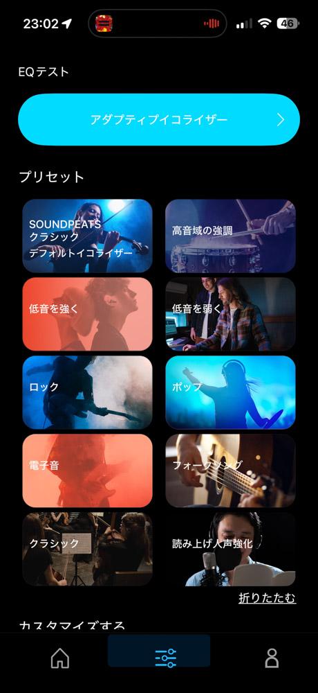 ユーザーの聴覚に合わせてチューニングしてくれるアダプティブイコライザー、10種類のプリセット、さらに自分で調整できるカスタムイコライザーが選択可能です。