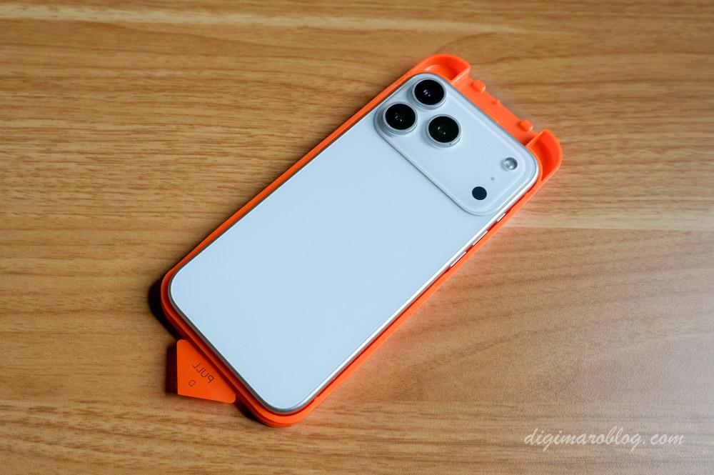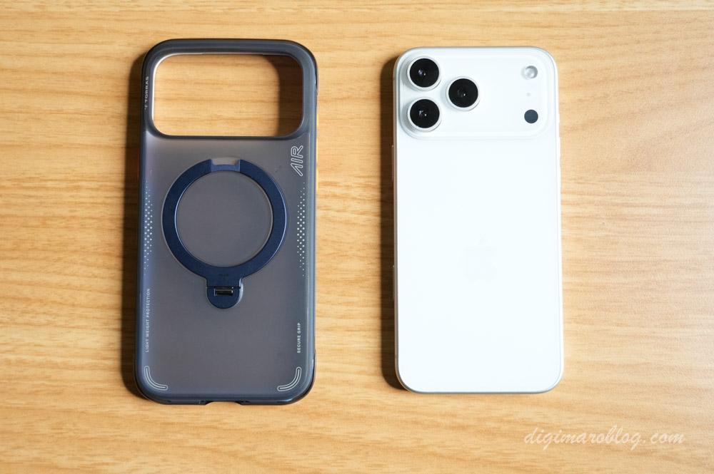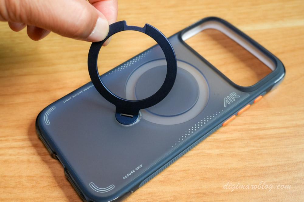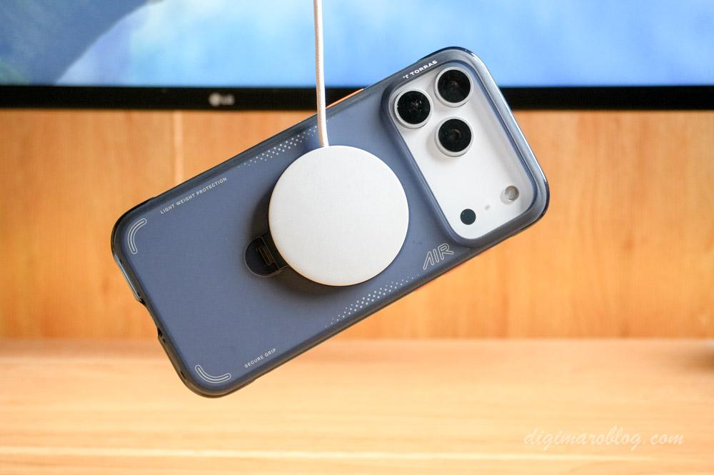 実際にTOORAS Ostand Q3 Airを、iPhone17 Pro Maxに装着します。