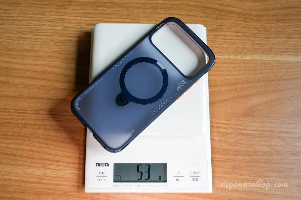 iPhone17ProMax用で53g(実測)は、一般的なケースと比べるとそこまで軽量とはいえませんが、金属の回転リング付きケースでの重量と考えれば十分、軽量といえます。