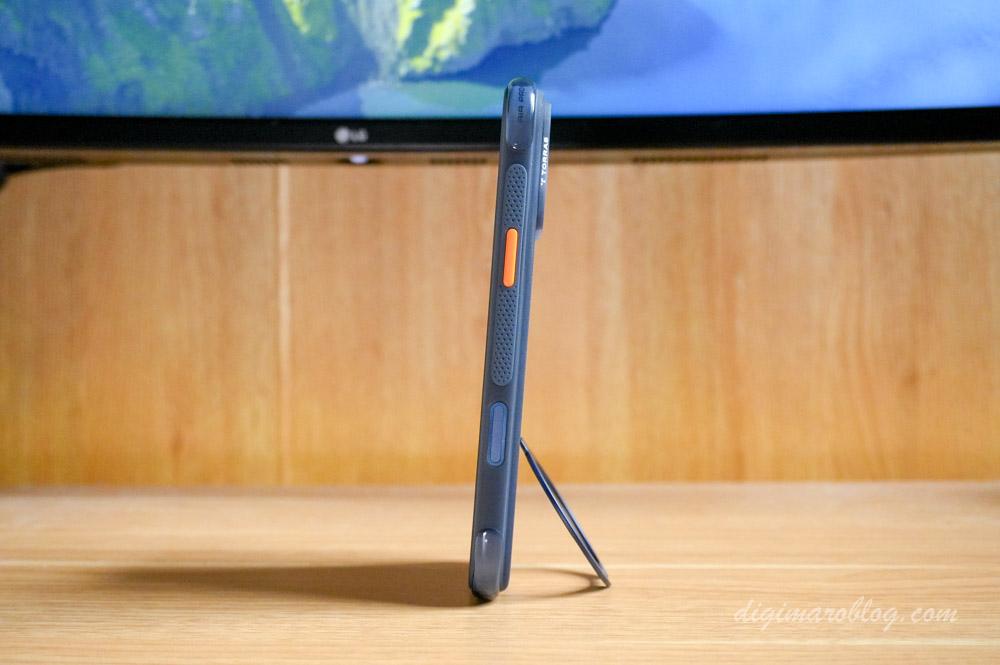 実際に使ってみて、ゼンマイ式スタンドの使いやすさと、耐衝撃性に優れた安心感のあるケースです。