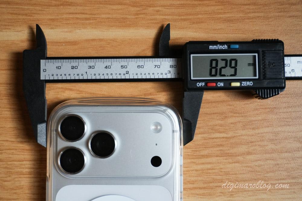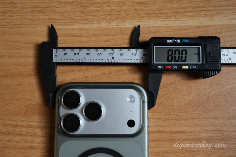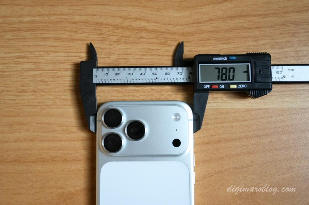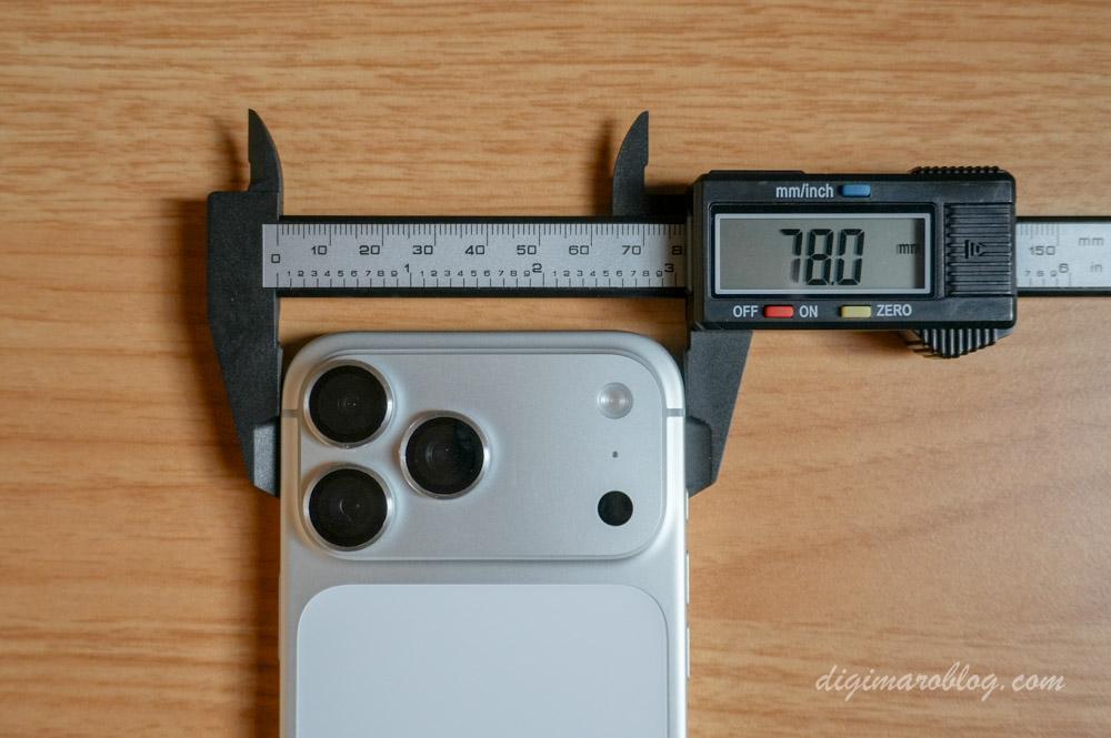 iPhone 17 Pro Maxの横幅は78mm(ボタン含まず)、対してケース込みの横幅は80mm。